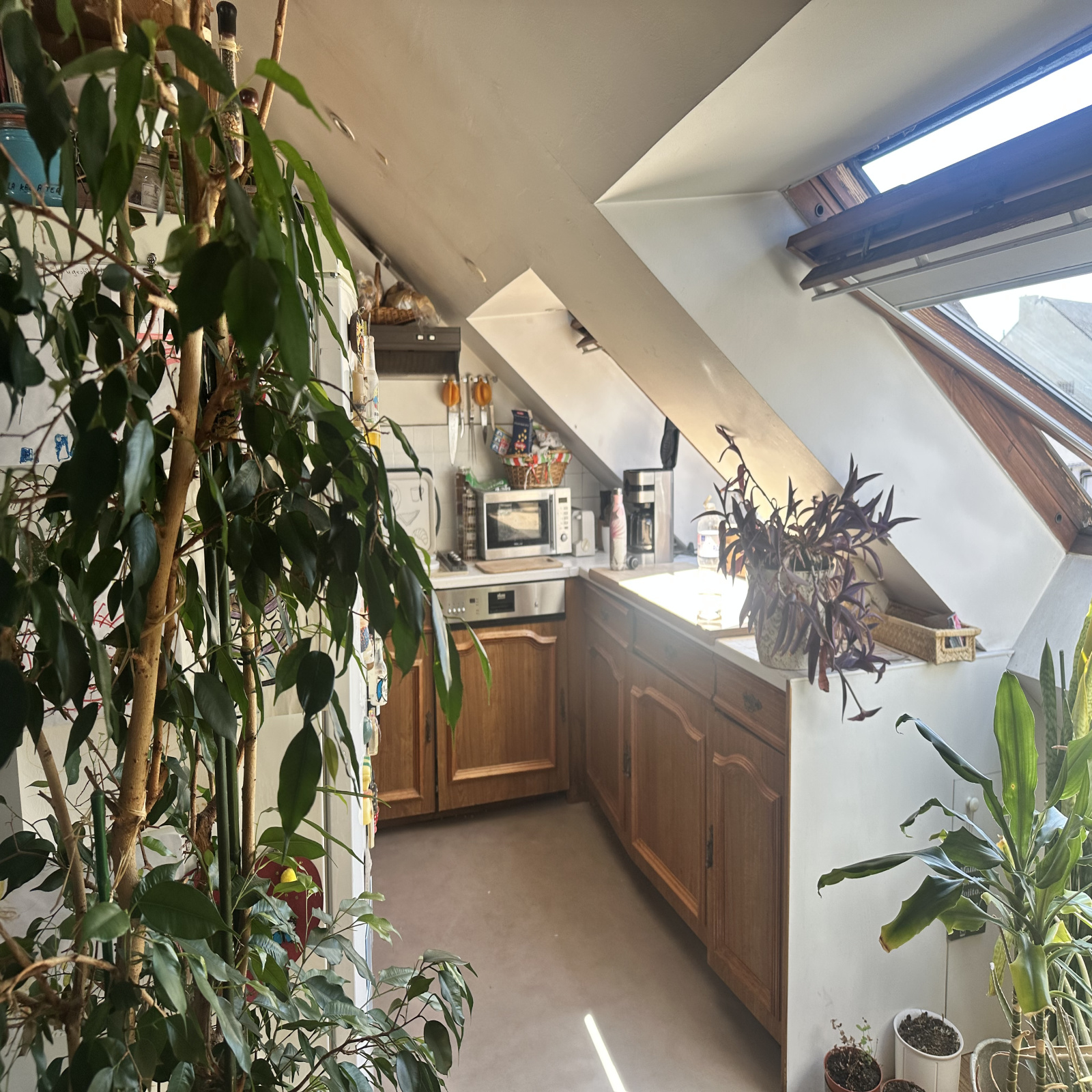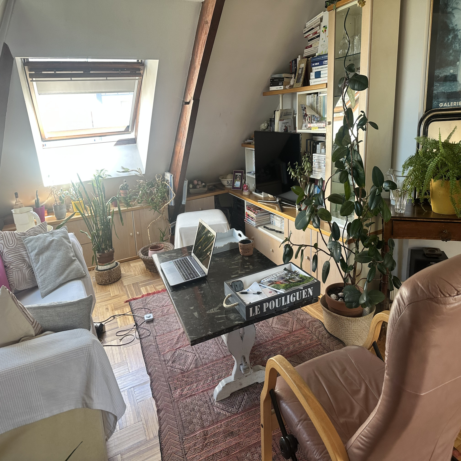 Centre POULIGUEN Bel appartement dans immeuble ancien de 65m2 au sol ( 35 m2 loi carrez). Séjour , cuisine ouverte équipée , couloir , 2 chambres , 1 SDB, nombreux rangements .Huit véluxs éclairent généreusement cet appartement .